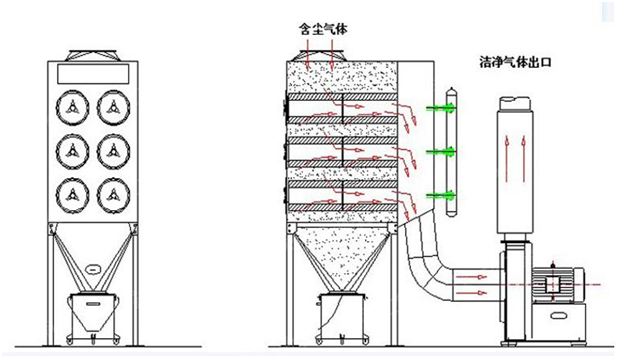 如圖所示,粉塵通過吸入口進入集塵器后,首先碰到進風口中間的斜隔擋板,對進入的氣體起到了擾流的作用,改變粉塵的運行方向,同時氣流速度變慢,由于重力沉降作用,使氣體中粗顆粒粉塵直接落入灰斗,起到預(yù)除塵的作用。進入灰斗的氣流隨后向上流動,經(jīng)過濾筒,粉塵被捕集在過濾筒的表面。凈化后的氣體進入濾筒室上部的清潔室,匯集到排氣口排出。