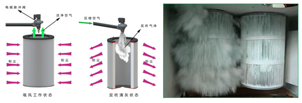 每次噴吹清灰在0.1~0.3S左右完成,就是這一瞬間噴出的高壓空氣起到良好的清灰效果。空氣以高的流速進入過濾筒,使得過濾筒急劇膨脹,引起一次沖擊振動,使附在過濾筒的粉塵被抖落,濾料表面吸附的微塵在氣流作用下被抖落至集塵斗中。脈沖噴吹氣壓為0.4~0.6MPa,且運行中須保持恒定不變的供氣量。