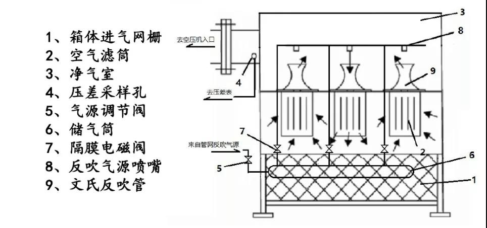 自潔過程: 含塵空氣氣經(jīng)過濾后,塵埃被吸附在高效過濾筒上,由 PLC 按設(shè)定時間順序進(jìn)行反吹自潔過程, 當(dāng)阻損值超過 600 帕?xí)r,由 PLC 按差壓順序控制反吹自潔過程(反吹時間為 0.1-0.2 秒)。其它高效過濾筒照常工作,塵埃被反吹自潔下來。