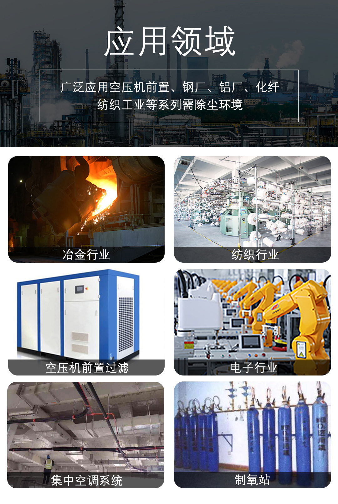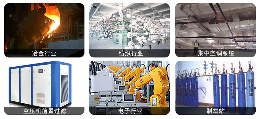 廣泛應(yīng)用于:冶金行業(yè),紡織行業(yè),空壓機(jī)前置過(guò)濾,電子行業(yè),集中空調(diào)系統(tǒng),制氧站