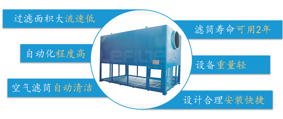 自潔過程: 含塵空氣氣經過濾后,塵埃被吸附在高效過濾筒上,由 PLC 按設定時間順序進行反吹自潔過程, 當阻損值超過 600 帕時,由 PLC 按差壓順序控制反吹自潔過程(反吹時間為 0.1-0.2 秒)。其它高效過濾筒照常工作,塵埃被反吹自潔下來。
